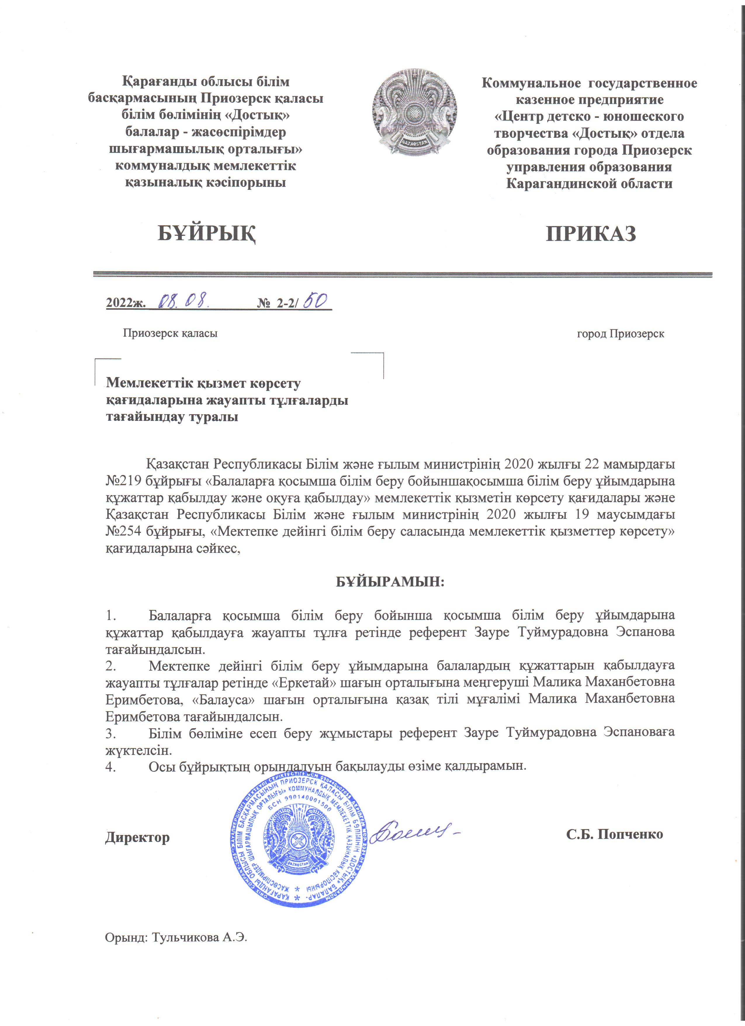 Мемлекеттік қызмет көрсету қағидаларына жауапты тұлғаларды тағайындау