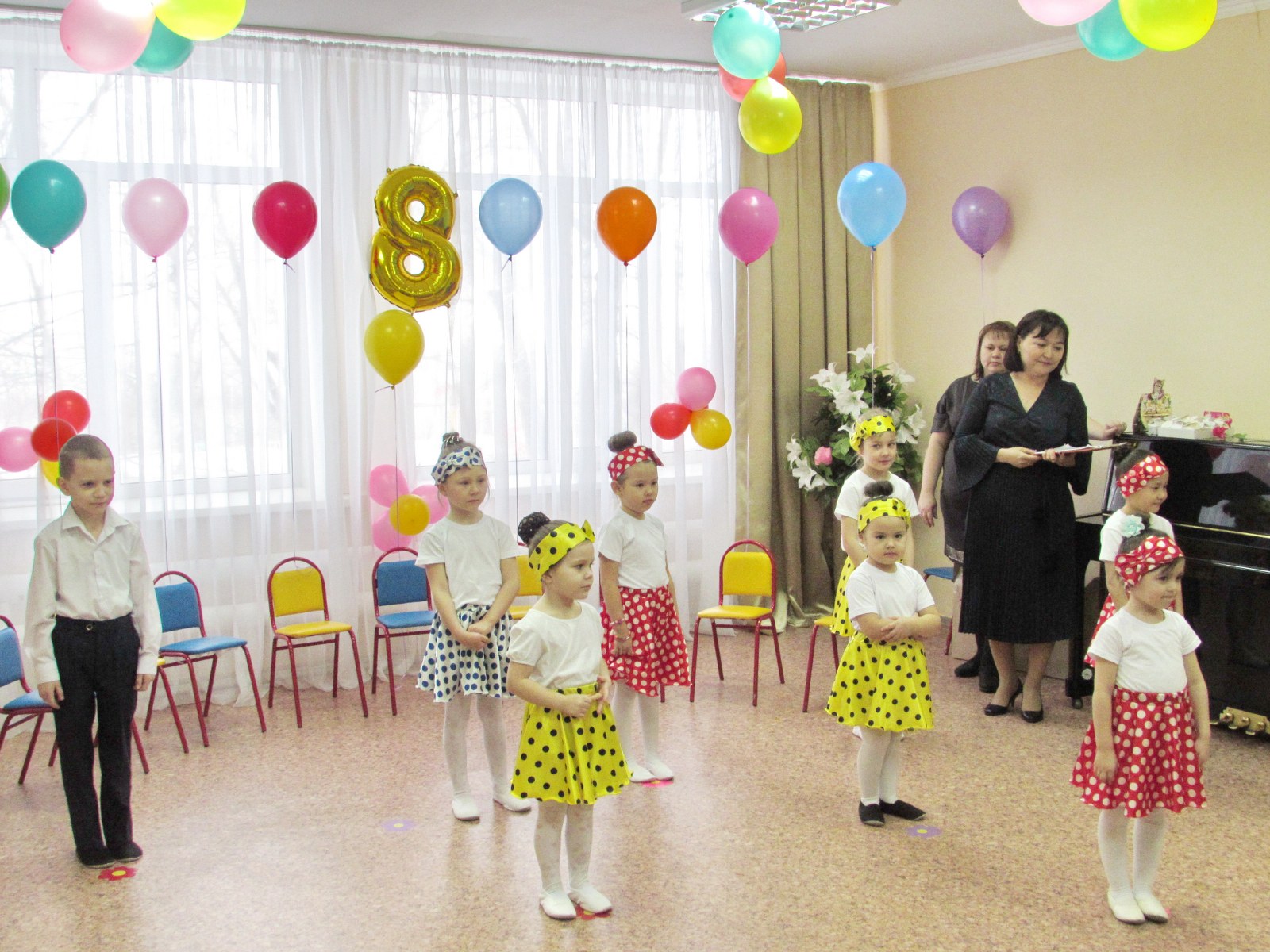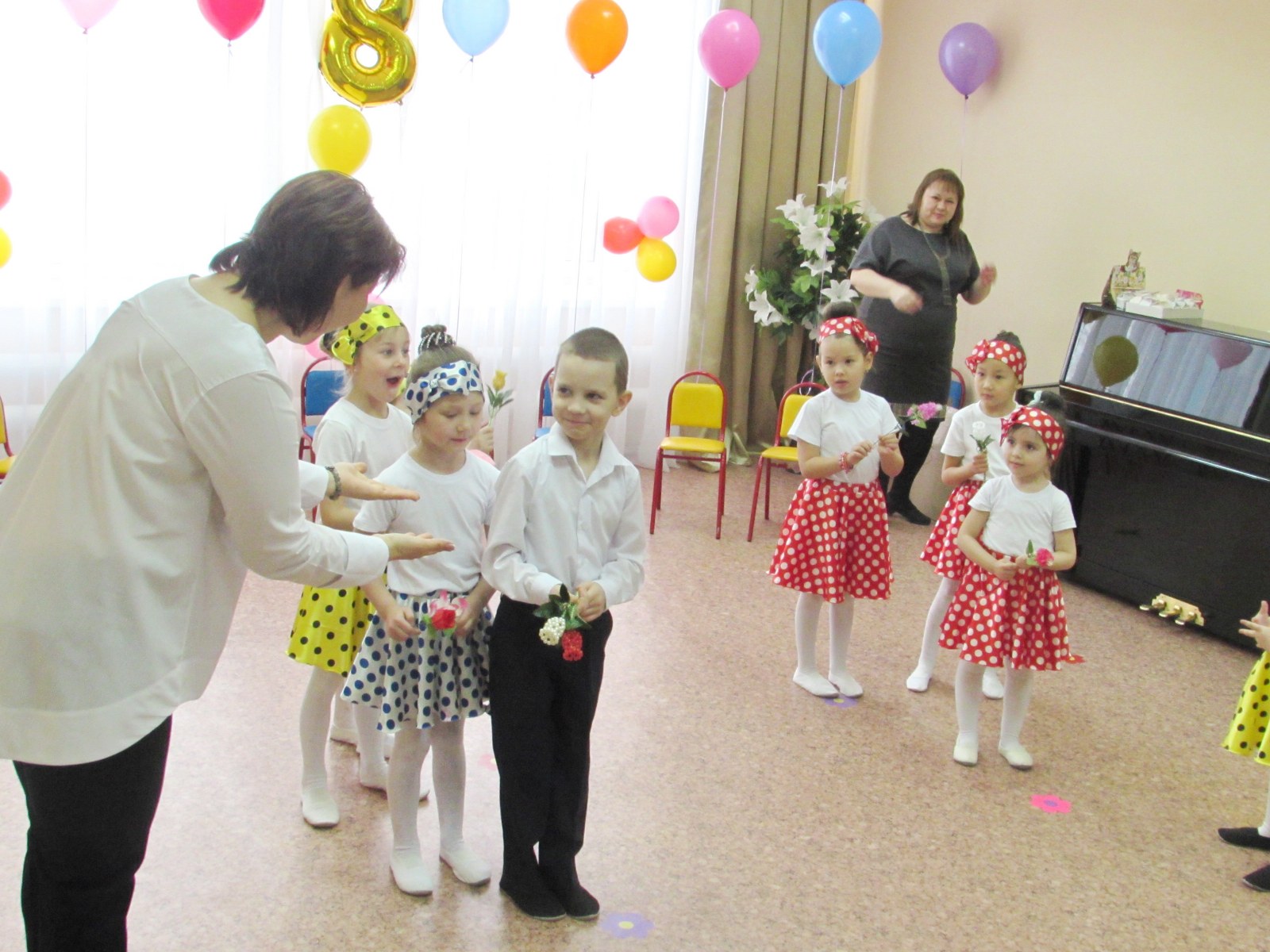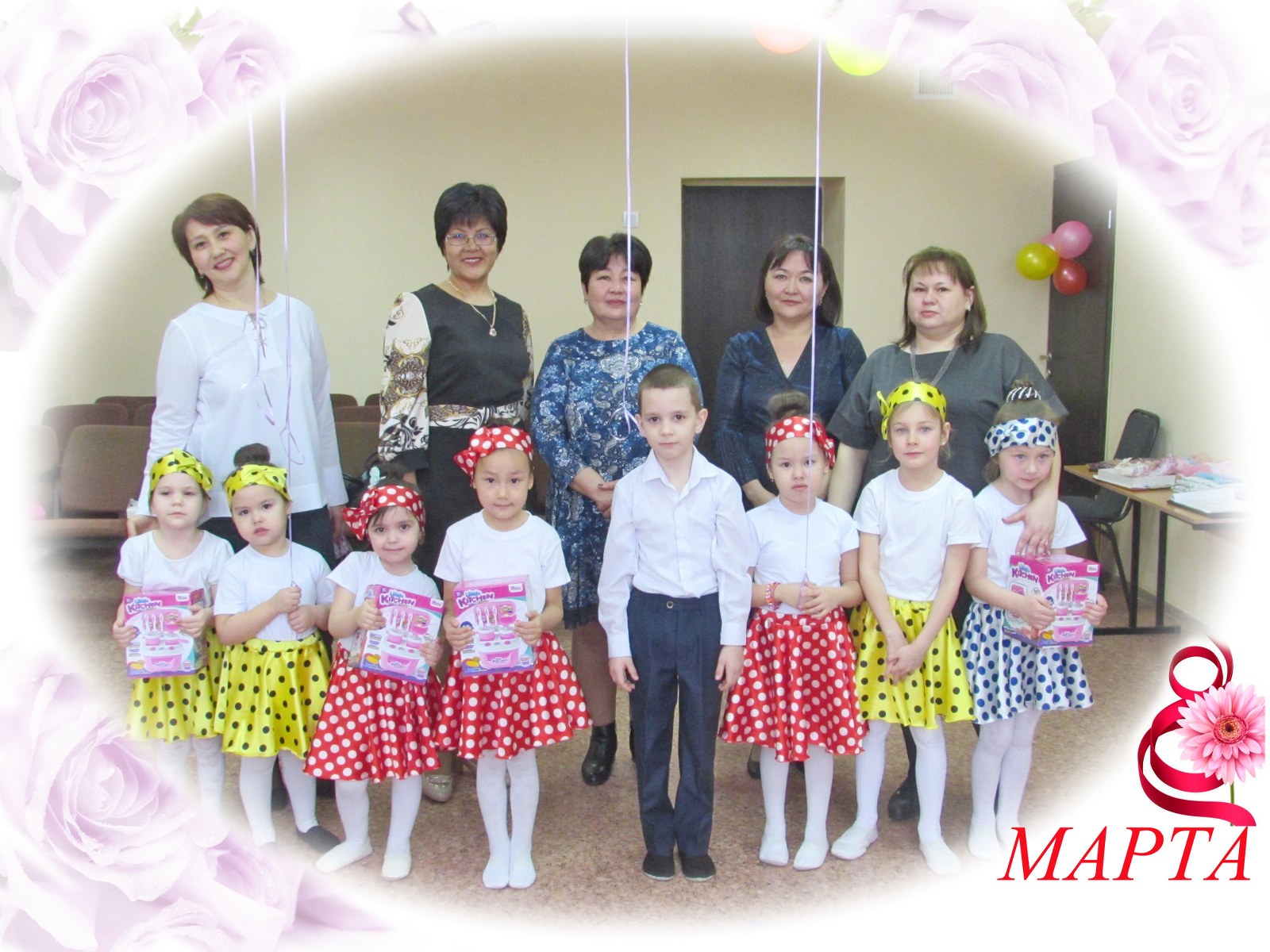 Мерекелік ертеңгілік соңында балалар аналарға әуе шарлары мен өз қолдарымен жасалған әшекейлерді сыйлады.
