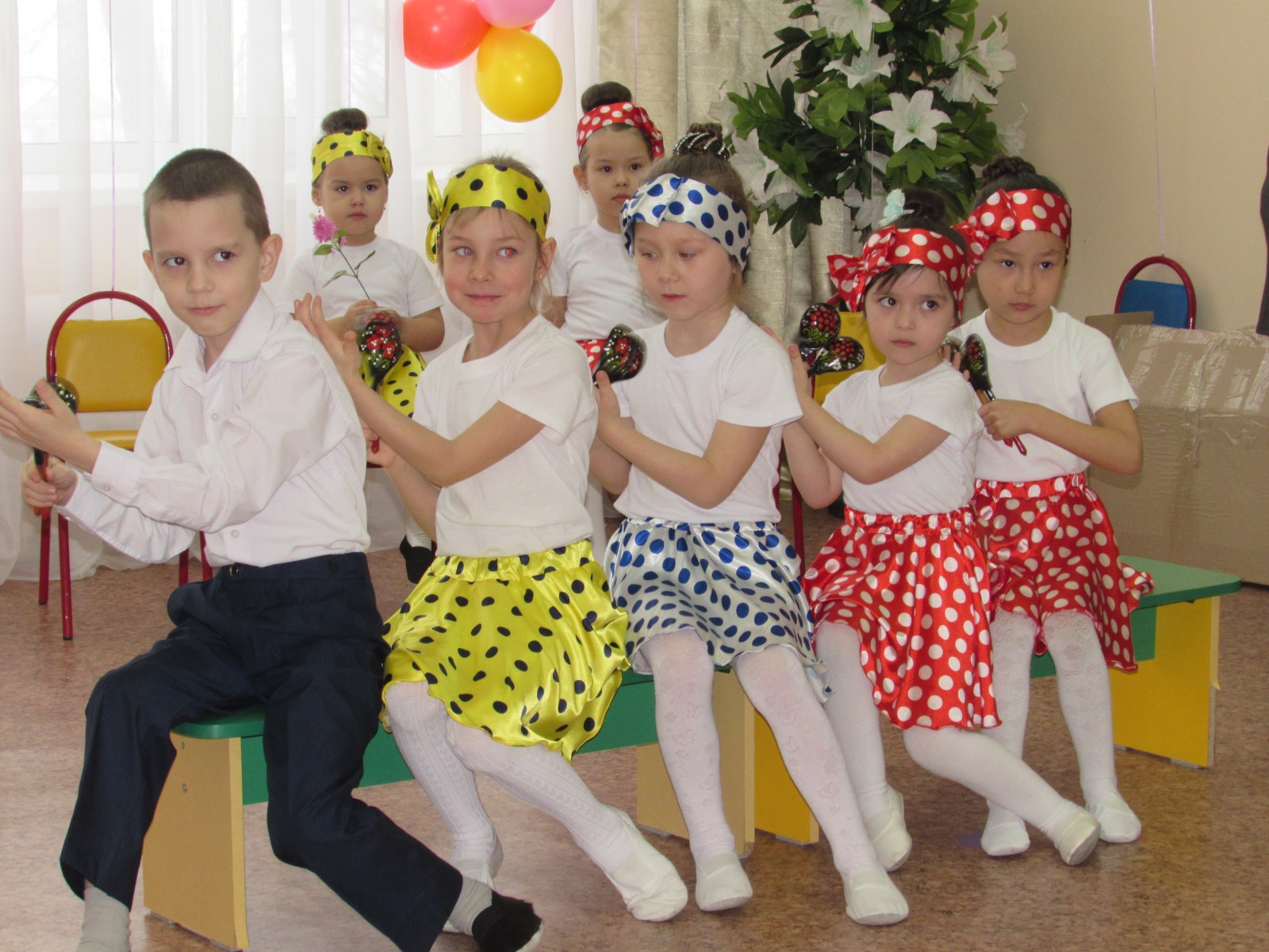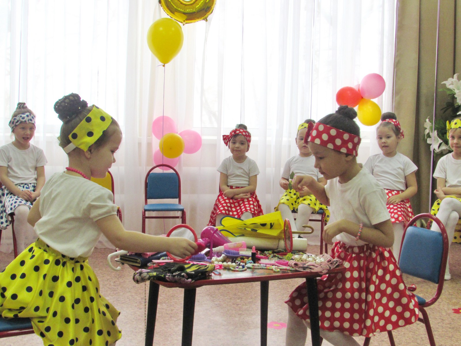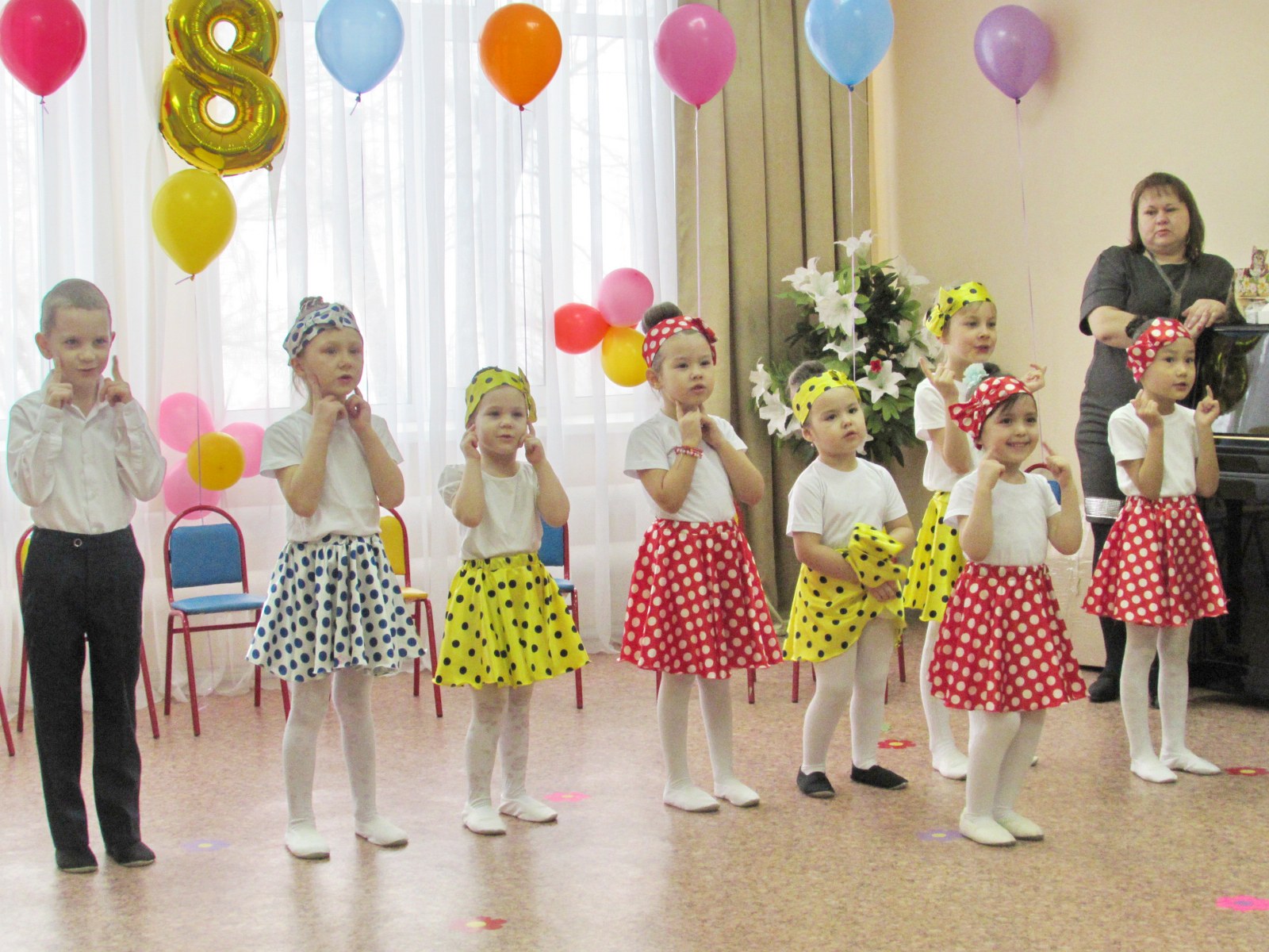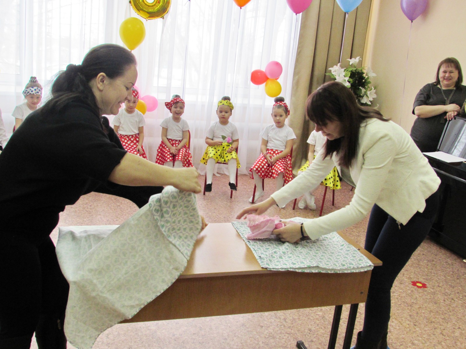 Мерекелік ертеңгілік соңында балалар аналарға әуе шарлары мен өз қолдарымен жасалған әшекейлерді сыйлады.