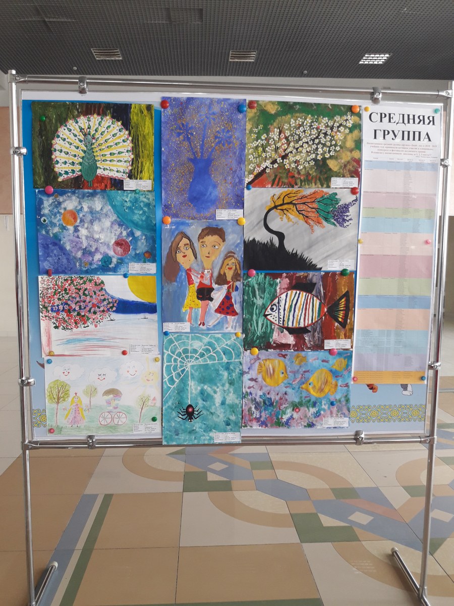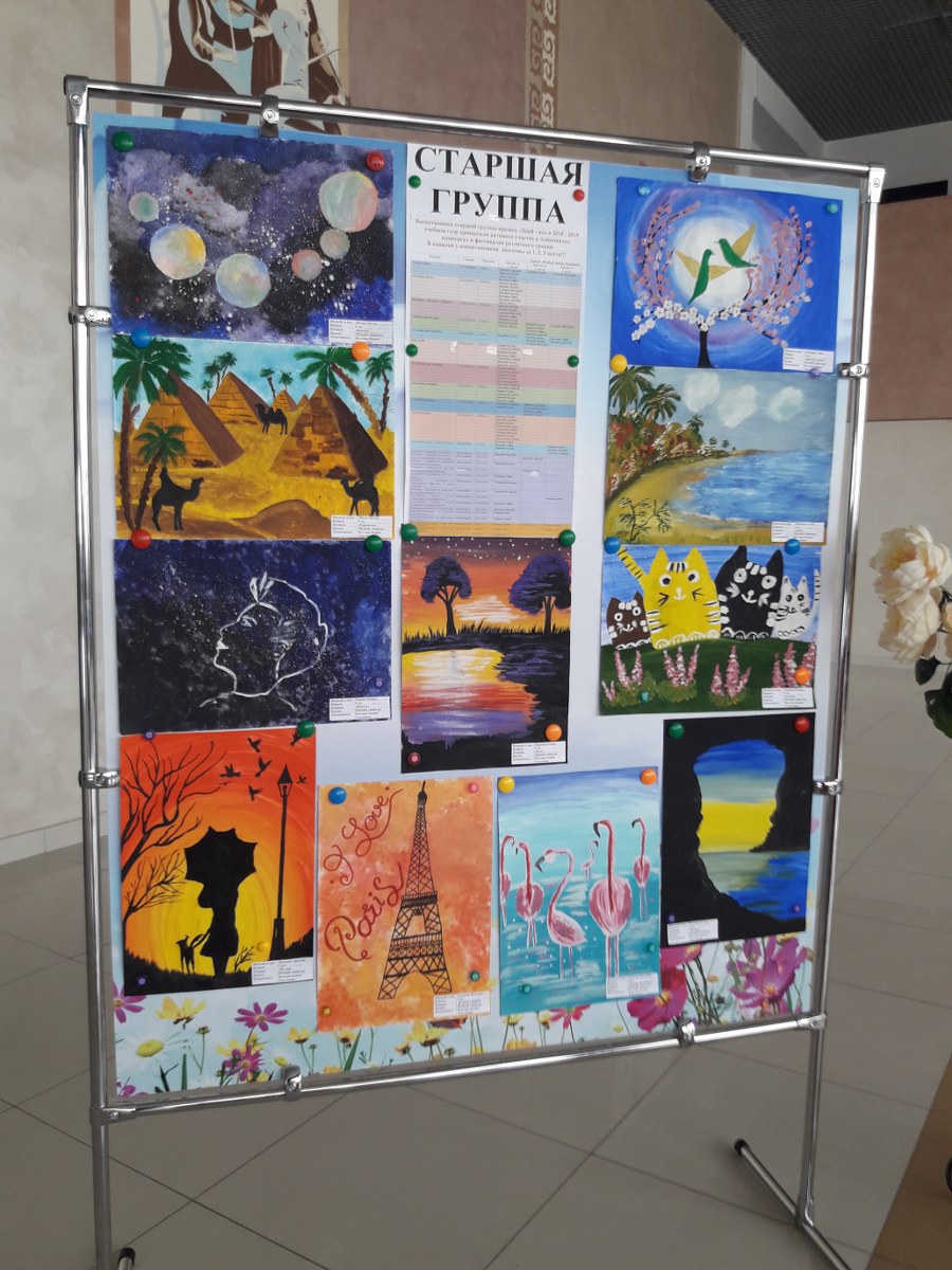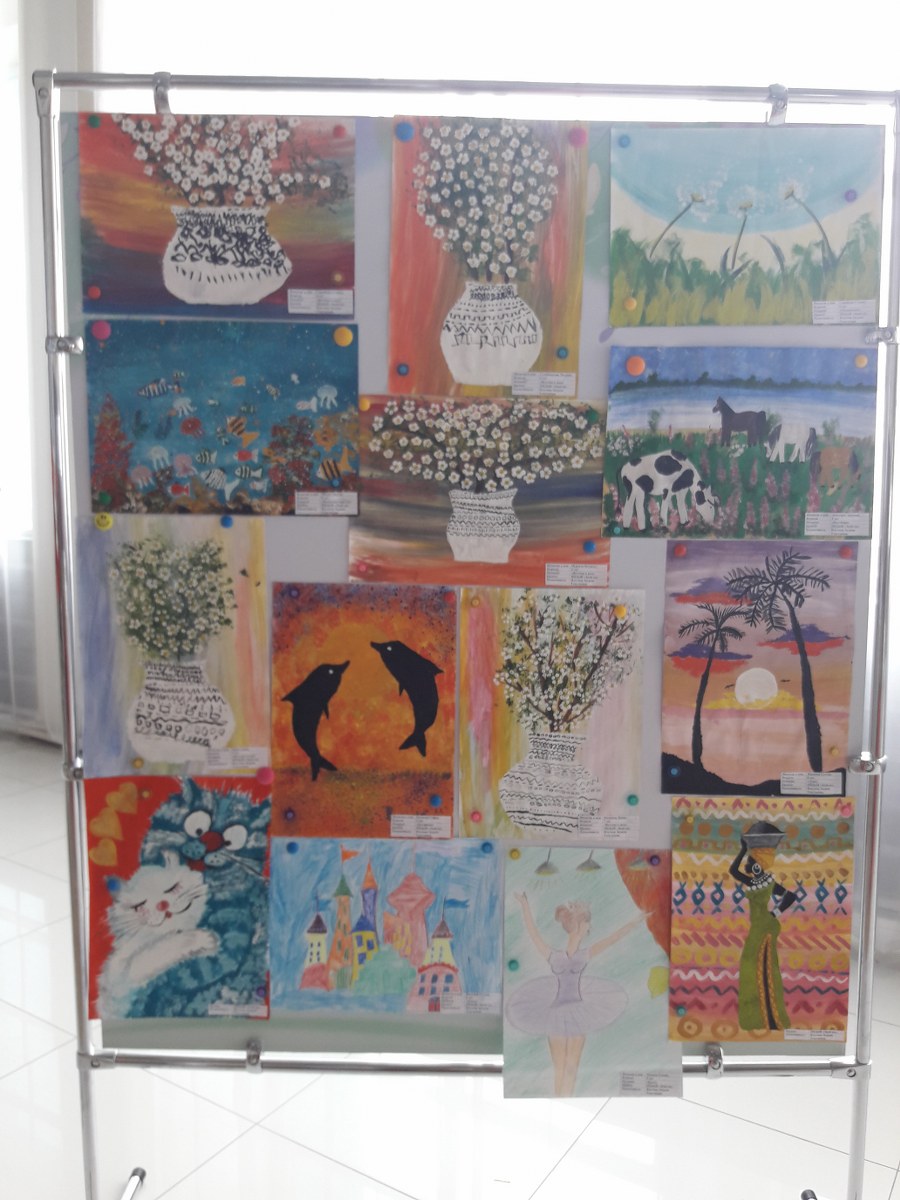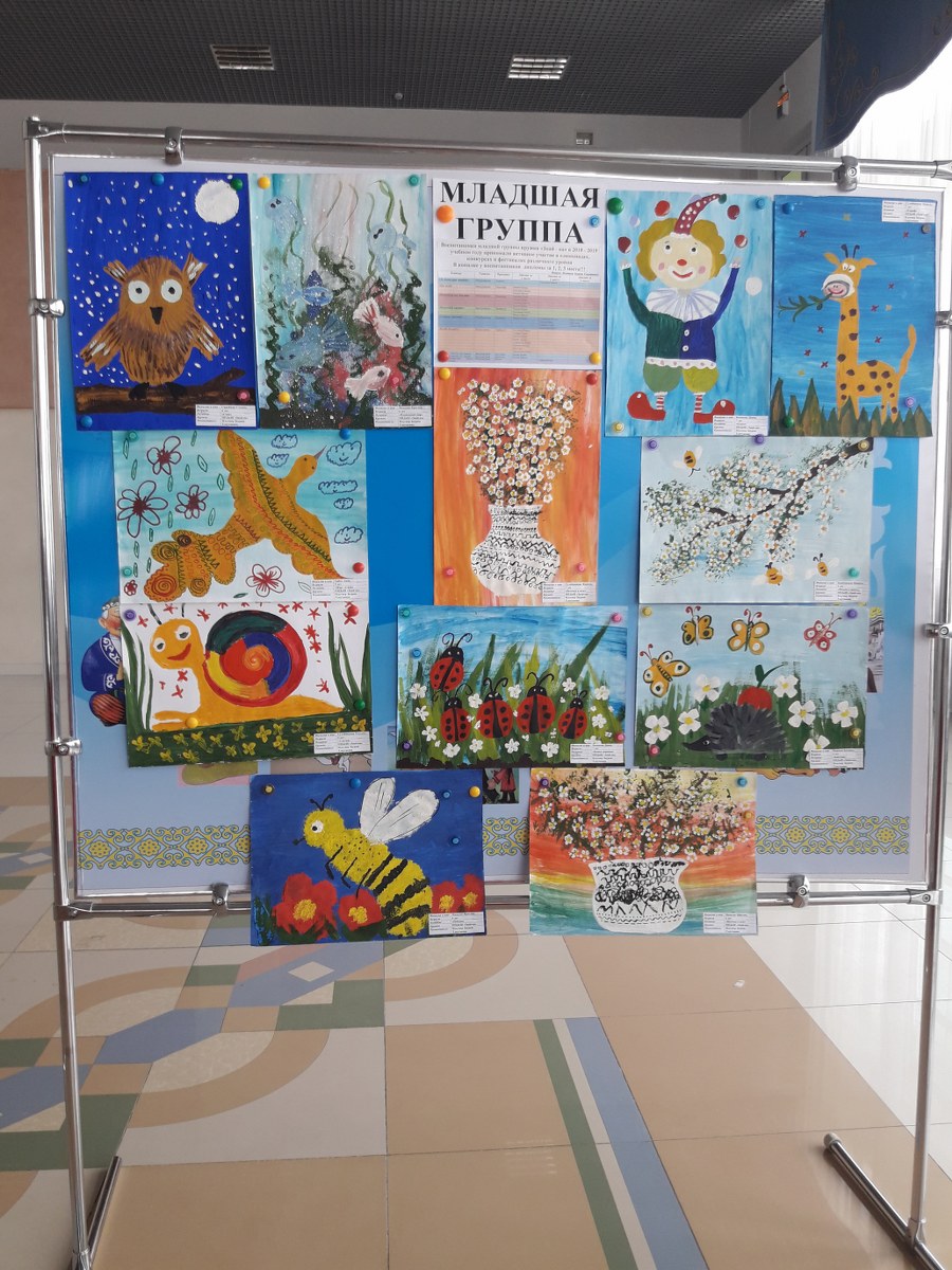 2019 жылдың 30 сәуірінде балалар жұмыстарының есептік көрмесі ұйымдастырылып өткізілді. Қонақтар мен көрермендер назарына "Ересек", "Орташа", "Кіші" жас ерекшеліктері бойынша, "Знай-ка" үйірмесінің бейнелеу өнерінің жұмыстары ұсынылды.